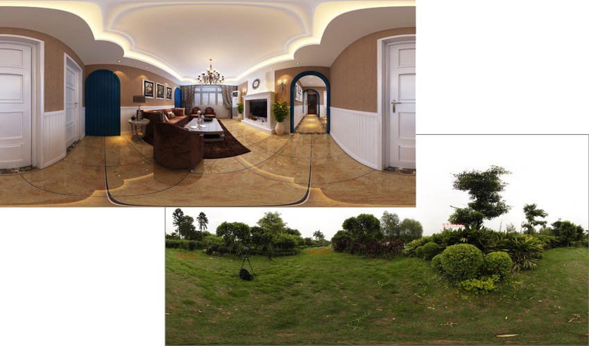 以上类型的图片为“球形全景图”(长宽比2:1),可通过“PTgui拼接实景照片”或“3Dmax渲染虚拟效果图”两种方式得到。点此了解球形全景图的制作方法