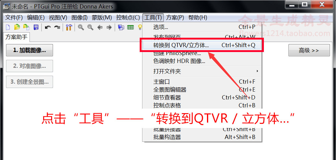 1、 打开 PTgui 软件,依次点击上方“工具”——“转换到QTVR / 立方体…”【 PTgui拼接软件下载 】