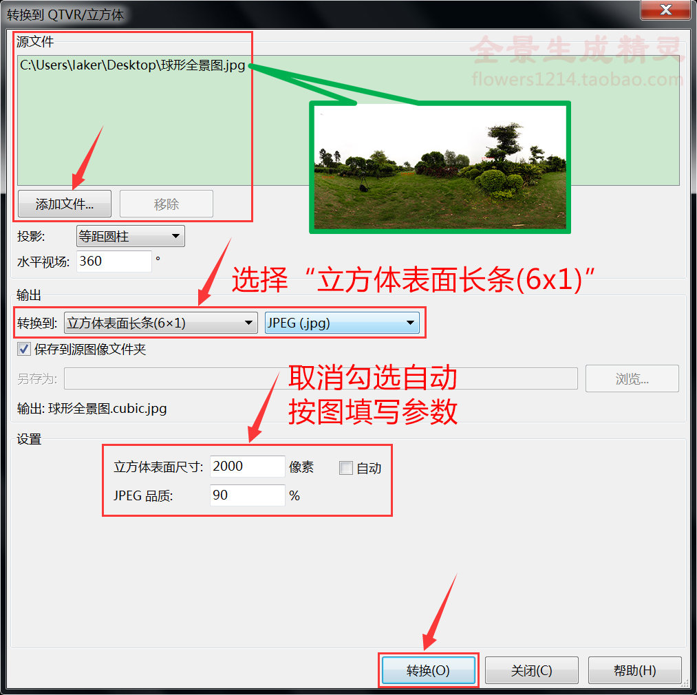 2、添加“球形全景图”,选择输出“立方体表面长条(6x1)”。注意底部的参数一定要手动填写,尺寸用整数,品质不要超过95,一般按图中即可,然后点击“转换”。